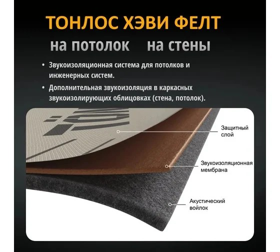 Tonlos Heavy Felt – многослойный звукоизоляционный материал, состоящий из тяжелой вязкоэластичной полимерной звукоизоляционной мембраны и акустического войлока. Такое сочетание обеспечивает высокую звукоизолирующую способность при толщине материала всего 13 мм.